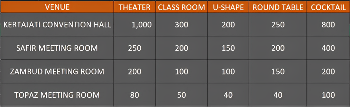 There are 3 meeting rooms and convention hall as a perfect place to conduct meeting and events
